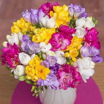 Фрезии бывают самых разных цветов: белые, розовые, жёлтые, красные, сиреневые, а также двухцветные. Они прекрасно смотрятся как в классических нежных букетах, так и в ярких контрастных композициях.