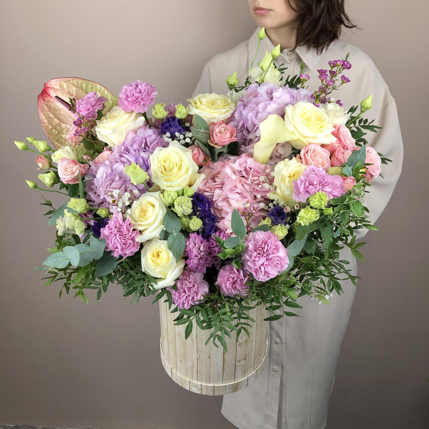 Букеты оформляются в дизайнерской упаковке или в корзинах, размеры которых могут достигать XXL — настоящий вау-эффект при вручении гарантирован.