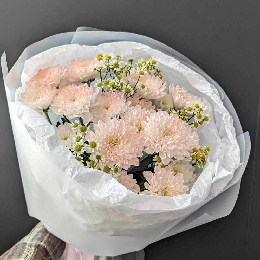 Теплый и уютный букет, где персиковые хризантемы сияют в окружении белых маргариток и свежей зелени. Завернутый в белую бумагу с лентой, он напоминает о мягких закатах и станет прекрасным подарком для поднятия настроения.