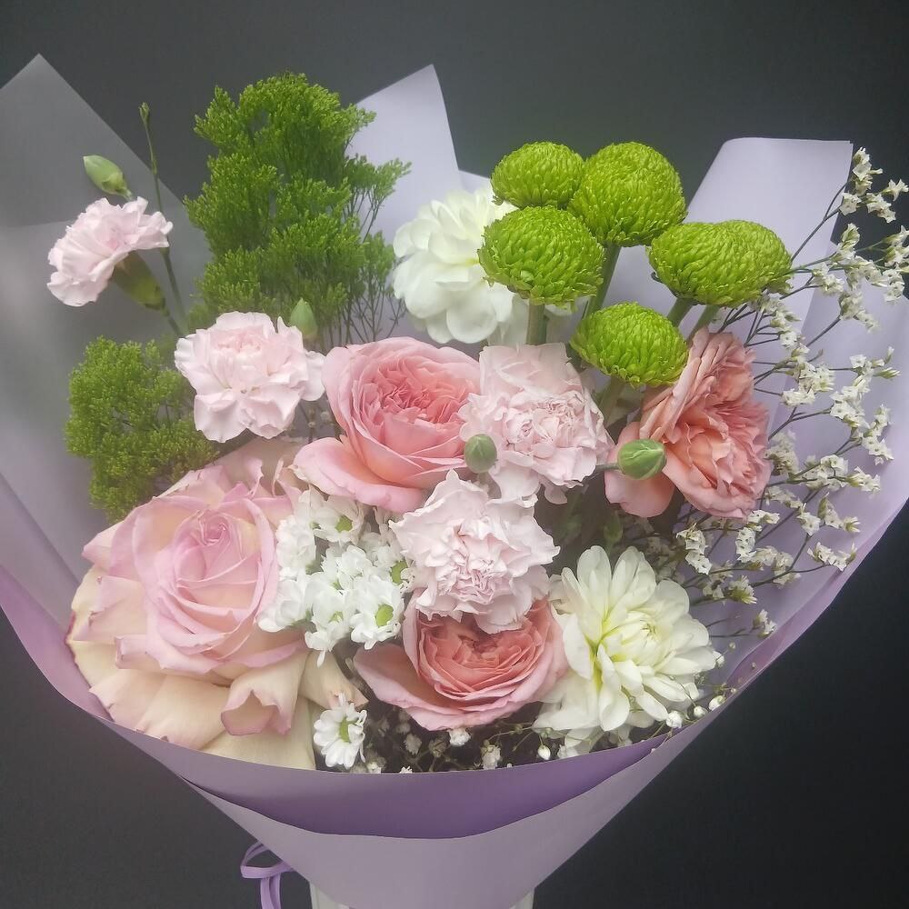 Нежный букет, где розовые розы и гвоздики переплетаются с белыми хризантемами и яркими синими акцентами. Обёрнутый в лиловую и белую бумагу, он создаёт атмосферу легкости и романтики, подходящую для подарка или украшения.