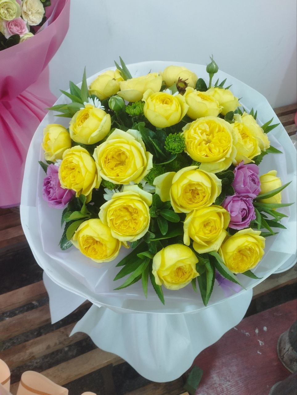💛 Яркие жёлтые розы словно лучики солнца, дополненные сиреневыми розочками и свежей зеленью. Букет наполняет счастьем и светом — отличный подарок для любого праздника.