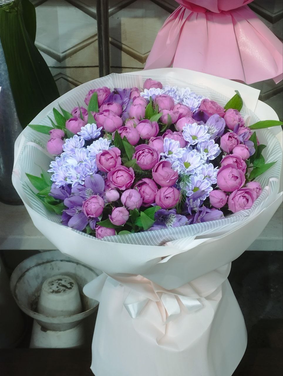 Этот очаровательный букет сочетает нежные оттенки лилового и розового, где пышные пионы соседствуют с изящными астрами и деликатными фрезиями. Завернутый в белоснежную бумагу с атласной лентой, он словно шепчет о романтике и мечтах. Идеален для выражения теплых чувств или украшения интерьера, где каждый лепесток несет нотку весенней свежести и утонченной элегантности.